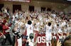 Senior forward Sam Alexis and junior guard Nick Dorn run to the student section after their victory over Purdue on Jan. 27, 2026, at Simon Skjodt Assembly Hall in Bloomington. The reported attendance for the game was 17,222.