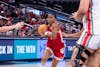 Redshirt sophomore guard Lenée Beaumont looks to pass during a game against Ohio State in the second round of the Big Ten Tournament on March 5, 2026, at Gainbridge Fieldhouse in Indianapolis. Beaumont played for 29 minutes.