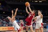 Redshirt sophomore guard Lenée Beaumont takes a shot during the game against Nebraska in the first round of the Big Ten Tournament on March 4, 2026, at Gainbridge Fieldhouse in Indianapolis. Beaumont scored 14 points in the game.