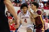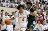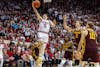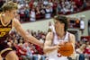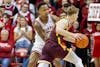 Senior forward Sam Alexis pushes past a Minnesota player during the game March 4, 2026, at Simon Skjodt Assembly Hall in Bloomington. Alexis scored 23 points in the game.