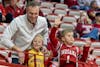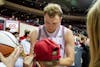 Redshirt senior forward Tucker DeVries signs his autograph for a fan after the game against Minnesota on March 4, 2026, at Simon Skjodt Assembly Hall in Bloomington. It was DeVries' last regular season game in Assembly Hall.