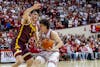 Junior guard Nick Dorn guards a Minnesota player during the game March 4, 2026, at Simon Skjodt Assembly Hall in Bloomington. Dorn scored 11 points in the game.