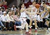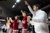 Indiana players and coaches celebrate a 3-pointer during the game against Michigan State on March 1, 2026, at Simon Skjodt Assembly Hall in Bloomington. The Hoosiers lost to the Spartans 77-64.