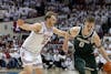 Redshirt senior forward Tucker DeVries guards Michigan State senior forward Jaxon Kohler during the game against Michigan State on March 1, 2026, at Simon Skjodt Assembly Hall in Bloomington. Kohler had 21 points in the game.