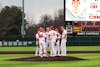 The Hoosiers huddle together on the pitching mound as they take on Bradley at home on Feb. 17, 2026, at Bart Kaufman Field in Bloomington. The Hoosiers finished 2-2 in their weekend series against Western Kentucky University on Sunday.