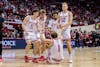 The Indiana men's basketball team helps senior forward Reed Bailey to his feet in a game against the University of Wisconsin-Milwaukee on Nov. 12, 2025, at Simon Skjodt Assembly Hall in Bloomington. The Hoosiers fell to Michigan 86-72 on Tuesday.