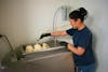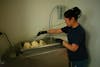 An employee sprays water into the dough kneader Feb. 22, 2026, at Tortilleria Azteca in Seymour, Indiana. The employees make around three batches a day.