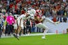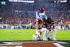Sophomore wide receiver Charlie Becker (left) and redshirt junior wide receiver Omar Cooper Jr. (right) kneel before the start of the national championship game Jan. 19, 2026, at Hard Rock Stadium in Miami Gardens, Florida. The duo combined for nine receptions.