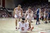 Redshirt guard Conor Enright and redshirt senior forward Tucker DeVries help redshirt senior guard Tayton Conerway off the ground as they play Penn State on Dec. 9, 2025, at Simon Skjodt Assembly Hall in Bloomington. The Hoosiers lost their fourth straight game after falling to Michigan on Tuesday.