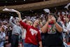 An Indiana fan pumps his fist in the air Jan. 19, 2026, in Simon Skjodt Assembly Hall in Bloomington. He cheered as the Hoosiers got their first touchdown of the game.