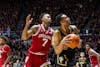 Indiana junior guard Nick Dorn (left) puts pressure on senior forward Trey Kaufman-Renn during the game against Purdue on Feb. 20, 2026, at Mackey Arena in West Lafayette, Indiana. The Hoosiers lost to the Boilermakers 64-93.