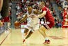 Fifth-year senior guard Lamar Wilkerson drives to the basket against Wisconsin on Feb. 7, 2026, inside Simon Skjodt Assembly Hall in Bloomington. Wilkerson led the Hoosiers with 25 points.