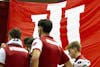 A flag with the IU logo waves behind Wisconsin basketball players during the game Feb. 7, 2026, at Simon Skjodt Assembly Hall in Bloomington. Indiana led Wisconsin 36-30 at halftime.