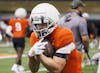 Tight end Brock Schott carries the ball during the Miami Hurricanes' practice Aug. 6, 2025, at the University of Miami in Coral Gables, Florida. Schott committed to the Hoosiers on Jan. 5, 2026.