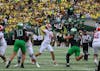 Indiana redshirt junior quarterback Fernando Mendoza throws the ball against Oregon on Oct. 11, 2025, inside Autzen Stadium in Eugene, Oregon. The Hoosiers and the Ducks both advanced to the College Football Playoff semifinals.