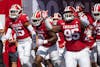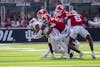 Indiana football defense tackles an opposing player during the game against Wisconsin on Nov. 15, 2025, at Memorial Stadium in Bloomington. The Hoosiers own the second-ranked defense in the country.