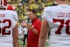 Indiana football head coach Curt Cignetti talks to redshirt junior quarterback Fernando Mendoza before they take on Oregon at Autzen Stadium on Oct. 11, 2025, in Eugene, Oregon. Rain hasn’t significantly impacted the Rose Bowl in 71 years.
