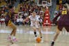 Sophomore guard Phoenix Stotijn dribbles down the court in the game against Minnesota on Dec. 29, 2025, at Simon Skjodt Assembly Hall in Bloomington. Stotijn had one rebound in the game.