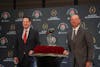 Indiana football head coach Curt Cignetti poses alongside the University of Alabama head coach Kalen DeBoer next to the Leishman Trophy on Wednesday after a press conference in Los Angeles ahead of the Rose Bowl. The Hoosiers arrived in California on Monday.