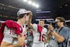 Redshirt freshman quarterback Alberto Mendoza (right) puts a Big Ten Championship hat on his brother, junior quarterback Fernando Mendoza (left), after the game Dec. 6, 2025, at Lucas Oil Stadium in Indianapolis. The Hoosiers defeated the Buckeyes 13-10.