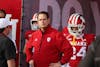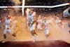 Redshirt sophomore defensive back Anthony Chung runs out of the tunnel with teammates before the Big Ten Championship game against Ohio State on Dec. 6, 2025, at Lucas Oil Stadium in Indianapolis. The Hoosiers became 13-0 with the win. (CORRECTED)