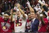 Redshirt junior quarterback Fernando Mendoza holds up an award after the Big Ten Championship game against Ohio State on Dec. 6, 2025, at Lucas Oil Stadium in Indianapolis. Mendoza had 222 passing yards in the game. (CORRECTED)