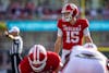 Redshirt junior quarterback Fernando Mendoza scans the defense in the game against Wisconsin on Nov. 15, 2025, at Memorial Stadium in Bloomington. Mendoza was awarded the Davey O’Brien Award on Friday.