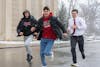 Sophomore Christian Stenger (left), senior Max Augustini (middle) and senior Rocco Jann (right) race during the Fernando Mendoza Lookalike Contest on Dec. 13, 2025, at Showalter Fountain in Bloomington. Max Augustini won the race.