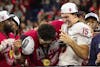 Attendees cheer for Max Augustini at the Fernando Mendoza Lookalike Contest on Dec. 13, 2025, at Showalter Fountain in Bloomington. The winner of the contest was decided by the amount of applause from attendees.