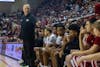 Head coach Darian DeVries calls a player off the bench at the end of the game against Oregon on Feb. 9, 2026, at Simon Skjodt Assembly Hall in Bloomington. With about 30 seconds left, DeVries replaced his starting players with ones sitting on the bench.