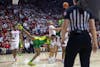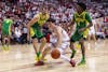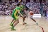 Indiana and Oregon basketball players fight for the ball during the game against Oregon on Feb. 9, 2026, at Simon Skjodt Assembly Hall in Bloomington. With the win, the Hoosiers moved to stand 8-6 in the Big Ten.