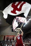 An Indiana cheerleader waves an IU flag to get fans excited for the game against Penn State on Dec. 9, 2025, at Simon Skjodt Assembly Hall in Bloomington. Indiana outscored Penn State in the first half 58-26.