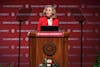 IU President Pamela Whitten delivers the State of the University address Dec. 9, 2025, at IU Indianapolis. Whitten discussed progress toward IU 2030, the university's strategic development plan.