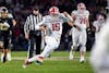 Redshirt junior wide receiver Omar Cooper Jr. jumps up to attempt a catch during the Big Ten Championship game against Ohio State on Dec. 6, 2025, at Lucas Oil Stadium in Indianapolis. Cooper sustained an apparent leg injury on the play and did not return to the contest.