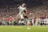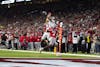 Redshirt junior wide receiver Omar Cooper Jr. jumps to attempt a catch during the Big Ten Championship game against Ohio State on Dec. 6, 2025, at Lucas Oil Stadium in Indianapolis. Cooper Jr. suffered a lower-body injury after the attempt.