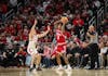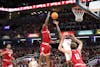 Fifth-year senior guard Lamar Wilkerson attempts to block a shot during the game against the University of Louisville on Dec. 6, 2025, at Gainbridge Fieldhouse in Bloomington. The Hoosiers lost to the Cardinals 87-78.