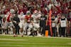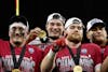 Redshirt junior linebacker Isaiah Jones (far left), redshirt junior quarterback Fernando Mendoza (left), redshirt junior linebacker Kaiden Turner (right) and sophomore defensive lineman Mario Landino (far right) celebrate after the Big Ten Championship game against Ohio State on Dec. 6, 2025, at Lucas Oil Stadium in Indianapolis. Indiana's defense held Ohio State to 58 rushing yards.