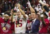 Members of the Indiana football team celebrate their win over Ohio State after the Big Ten Championship game Dec. 6, 2025, at Lucas Oil Stadium in Indianapolis. The Hoosiers defeated the Buckeyes 13-10.