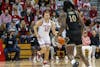 Redshirt senior forward Tucker DeVries holds the ball in a game against the University of Louisville on Dec. 6, 2025, at Gainbridge Fieldhouse in Indianapolis. The Hoosiers fell to the Cardinals by nine points.