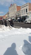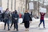 Protesters march in the street Jan. 30, 2026, at the corner of Indiana Avenue and Kirkwood Avenue in Bloomington. Protesters walked together from City Hall to Sample Gates.