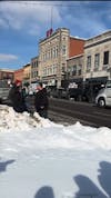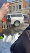 Two men argue at an anti-ICE protest at 2:34 p.m. Friday near the Monroe County Courthouse in Bloomington. The man wearing dark clothing appeared to have a shotgun slung around his body.