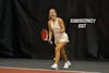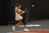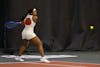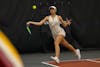 Indiana senior Nicole Teodosescu swings toward the ball during the match against the University of Cincinnati on Jan. 31, 2026, at the IU Tennis Center in Bloomington. Teodosescu won her singles match in two sets.