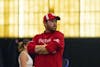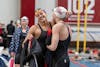 Junior swimmer Miranda Grana hugs her teammate after finishing her race against the University of Louisville on Jan. 30, 2026, at the Counsilman-Billingsley Aquatic Center in Bloomington. Grana finished first in the 100-yard backstroke.