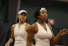 Freshman Alessandra Teodosescu (left) and freshman Ameia Sorey (right) meet following their doubles match during the match against the University of Cincinnati on Jan. 31, 2026, at the IU Tennis Center in Bloomington. The duo won their doubles match 6-4.
