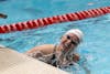An Indiana women's swimmer turns mid-race in a dual meet against the University of Louisville on Jan. 30, 2026, at the Counsilman-Billingsley Aquatic Center in Bloomington. Indiana women's swim and dive defeated Lousiville 161-138.