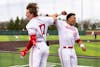 Sophomore left-handed pitcher and outfielder Caleb Koskie (left) and freshman catcher Owen ten Oever (right) celebrate a run during the game against Wright State University on March 10, 2026, at Bart Kaufman Field in Bloomington. The Hoosiers won 12-4.