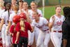 Indiana softball players high-five kids after the game against Loyola Chicago on March 10, 2026, at Andy Mohr Field in Bloomington. The Hoosiers defeated the Ramblers 11-6.