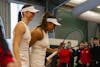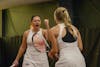 Indiana senior Nicole Teodosescu (left) and junior Chase Boyer (right) celebrate after winning their doubles match during the match against the University of Cincinnati on Jan. 31, 2026, at the IU Tennis Center in Bloomington. The pair won their doubles match 6-1.