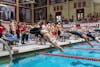 An Indiana women's swimmer takes off during a meet against the University of Louisville on Jan. 30, 2026, at the Counsilman-Billingsley Aquatic Center in Bloomington. The Hoosiers finished the regular season 7-2 following the meet.