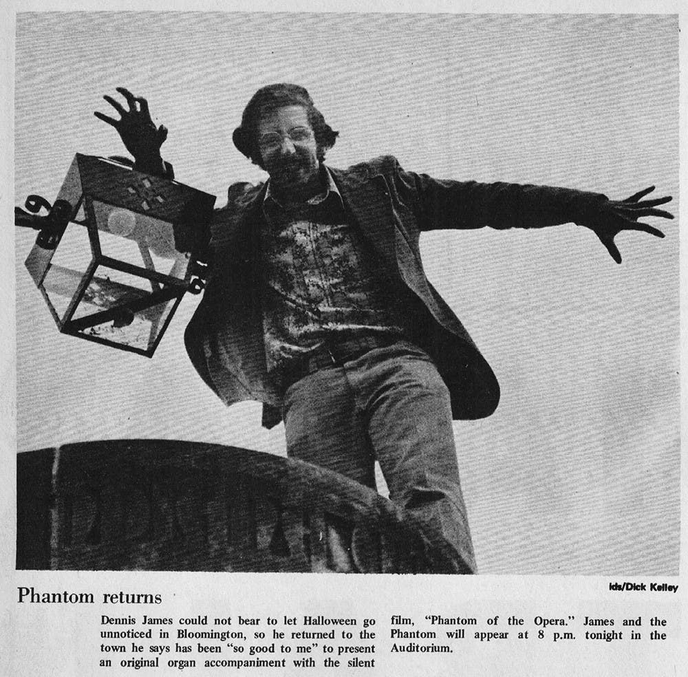 Oct. 31, 1972: "Dennis James, organist and originator of the silent film series which ran at the Auditorium for nearly two years, has been playing organ at the Organ Stop restaurant in Phoenix, Ariz. since summer."